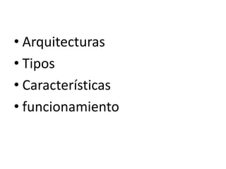 El documento describe los componentes principales de una CPU, incluyendo la unidad central de proceso y los tipos de arquitecturas como RISC y CISC. Explica que las CPUs modernas pueden clasificarse según su tamaño, buses de conexión y tipo de arquitectura, e identifica las características clave como el conjunto de instrucciones y modos de direccionamiento. Además, detalla las etapas de un ciclo de instrucción que incluyen la búsqueda, decodificación y ejecución de cada instrucción.