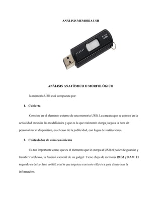 Este documento analiza la memoria USB, describiendo sus componentes internos como la cubierta, controlador de almacenamiento, chip de memoria flash y conector. Explica cómo funciona almacenando y transfiriendo archivos entre dispositivos. También discute la evolución histórica de la memoria USB y sus versiones mejoradas de velocidad de transferencia de datos.