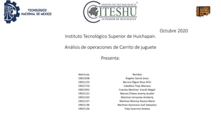 El documento presenta un análisis de las operaciones de ensamble de un carrito de juguete realizado por nueve estudiantes. El objetivo era perfeccionar la línea de ensamble mediante la combinación y eliminación de inspecciones para optimizar tiempos y movimientos. Identificaron que el tiempo de instalación de las llantas era un cuello de botella y propusieron ensamblar previamente las llantas con el chasis para reducir el tiempo total.
