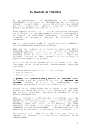 El documento describe los pasos para realizar un análisis de productos tecnológicos. Explica que el análisis de productos consiste en tres fases: 1) reconocimiento y análisis del problema, 2) síntesis, y 3) conclusión. Luego detalla siete tipos de análisis que pueden realizarse como parte de la segunda fase, incluyendo análisis morfológico, funcional, estructural, de funcionamiento, tecnológico, económico y comparativo. El objetivo general del anális