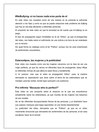 Este documento resume tres videos relacionados con la propaganda. El primer video trata sobre el bullying y cómo la sociedad debe hacer más para detenerlo. El segundo video discute cómo los estereotipos de género en la publicidad afectan la salud mental y física de las mujeres. El tercer video es una campaña sobre cómo los estereotipos excluyen a las personas con discapacidades. El documento analiza cada video y concluye que el primero y tercero usan la "propaganda del pathos" apelando a las emociones, mientras que el segundo util