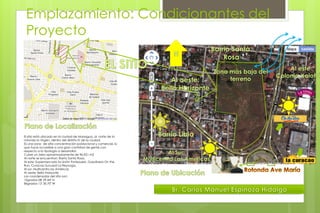 El proyecto está ubicado en el barrio Santa Rosa, Managua, en una zona de alta concentración comercial y poblacional, abarcando un área de 96,921 m2. El terreno presenta un suelo arenoso y moderadamente blando, lo que exigirá un mejoramiento para cumplir con la normativa de construcción, especialmente en una región sísmica. A pesar de contar con infraestructura básica, la escasez de agua y el alto nivel de ruido son desafíos importantes a considerar en el diseño del proyecto deportivo propuesto.