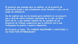 Este documento presenta un proyecto educativo sobre el Camino Mozárabe a Santiago que pasa por Extremadura. El proyecto involucra a los estudiantes en investigar diferentes aspectos del camino como paisajes, monumentos y leyendas a través de un enfoque de aprendizaje cooperativo. Los estudiantes trabajarán en grupos para crear presentaciones que resuman sus hallazgos. El proyecto busca motivar a los estudiantes a aprender sobre la historia y cultura de su región a través de una metodología práctica e inter