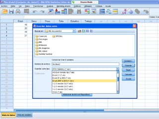 Este documento describe los pasos para realizar un análisis de variables utilizando el programa SPSS. Inicialmente se introducen los datos en una tabla y se especifican los tipos, anchuras, decimales y etiquetas de las variables. Luego, los datos se importan a SPSS y se realiza el análisis siguiendo los pasos indicados. Finalmente, el documento resume el proceso de análisis de variables a través de SPSS.
