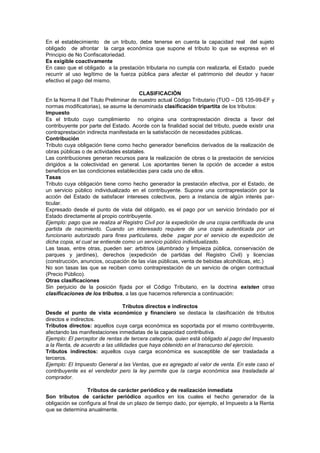 El documento resume los principales aspectos del Código Tributario Peruano, incluyendo la clasificación de tributos, los principios tributarios como la legalidad y no confiscatoriedad, las características de la obligación tributaria, los tipos de exenciones y la distinción entre evasión y elusión tributaria.