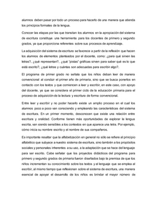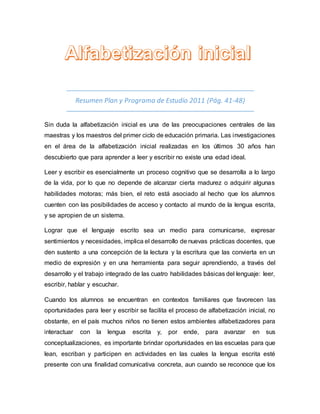 El documento discute la importancia de la alfabetización inicial y cómo ocurre el proceso de aprendizaje de la lectura y escritura. Explica que no existe una edad ideal para aprender, sino que es un proceso cognitivo que se desarrolla a lo largo de la vida. Señala que es importante brindar oportunidades en la escuela para que los estudiantes interactúen con la lengua escrita, aunque reconoce que deben pasar por un proceso formal. También resalta la importancia de que los maestros conozcan las etapas