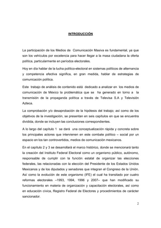 Este documento presenta un análisis del proceso electoral de 2009 en México a través de los medios de comunicación masiva como la televisión y la prensa. Se divide en seis capítulos que conceptualizan a los actores clave como el IFE, los partidos políticos, Televisa y TV Azteca, y analizan la historia de las reformas electorales en el país. También describe la metodología de análisis de contenido utilizada y examina el papel de los medios en los procesos electorales y su regulación. Finalmente,