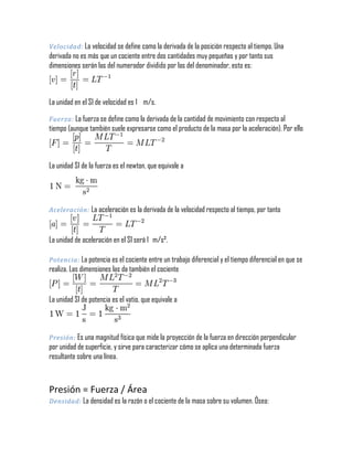 Este documento presenta las fórmulas físicas y dimensionales de varias magnitudes derivadas como velocidad, fuerza, aceleración, potencia, presión, densidad, peso específico y torque. Define cada magnitud y explica su unidad en el Sistema Internacional de Unidades. También incluye las ecuaciones físicas y dimensionales para calcular cada magnitud.