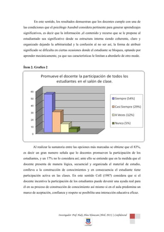 Este documento presenta un resumen del análisis e interpretación de los resultados de una investigación sobre los indicadores de aprendizaje significativo en clases de historia. Se analizaron 9 ítems a través de encuestas a estudiantes. Los resultados mostraron que los docentes generalmente presentan los contenidos de manera organizada, promueven la participación de los estudiantes, y las actividades generan aprendizaje. Sin embargo, no siempre se crea un ambiente armónico, las clases no facilitan herramientas para resolver problemas, y no se implementan diversas estrateg