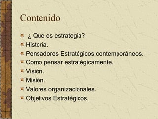 El documento presenta una introducción al análisis estratégico, incluyendo conceptos como visión, misión, objetivos estratégicos, análisis FODA y matrices FODA. Explica cómo desarrollar una visión y misión para una organización, y proporciona ejemplos. También describe cómo establecer objetivos medibles y realizar un análisis interno y externo para identificar fortalezas, debilidades, oportunidades y amenazas, con el fin de desarrollar estrategias.