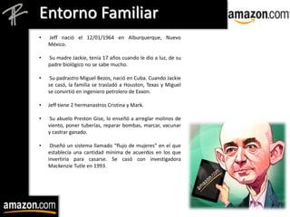El documento presenta un análisis estratégico sobre la creación y desarrollo de Amazon, inicialmente enfocándose en la historia personal y educación de Jeff Bezos. Se discuten las características del mercado de libros en línea y las estrategias comerciales que Amazon implementó para diferenciarse y crecer, incluyendo su enfoque en la satisfacción del cliente y la exploración de nuevos mercados. También se aborda la rápida expansión de la compañía, sus adquisiciones clave y el crecimiento significativo de sus ventas desde su fundación.