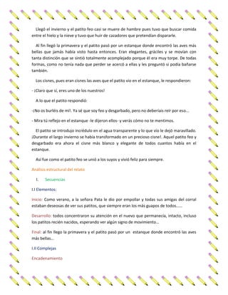 El cuento narra la historia de un patito feo que nace en una granja y es rechazado por su madre y hermanos por su apariencia. El patito sufre burlas y abandono, por lo que huye en busca de aceptación. Tras pasar un invierno difícil, encuentra un estanque con cisnes elegantes que lo aceptan. Al verse reflejado en el agua, descubre que se ha transformado en un hermoso cisne blanco.