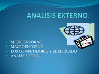 Este documento describe el análisis del entorno empresarial, incluyendo el microentorno y el macroentorno. El macroentorno se compone de factores PESTEL que pueden afectar a la industria, como políticos, económicos, tecnológicos, sociales, ambientales y legales. El microentorno analiza las cinco fuerzas competitivas de Porter: rivalidad de competidores, amenaza de nuevos ingresos, amenaza de productos sustitutos, poder de negociación de proveedores y poder de negociación de clientes. También