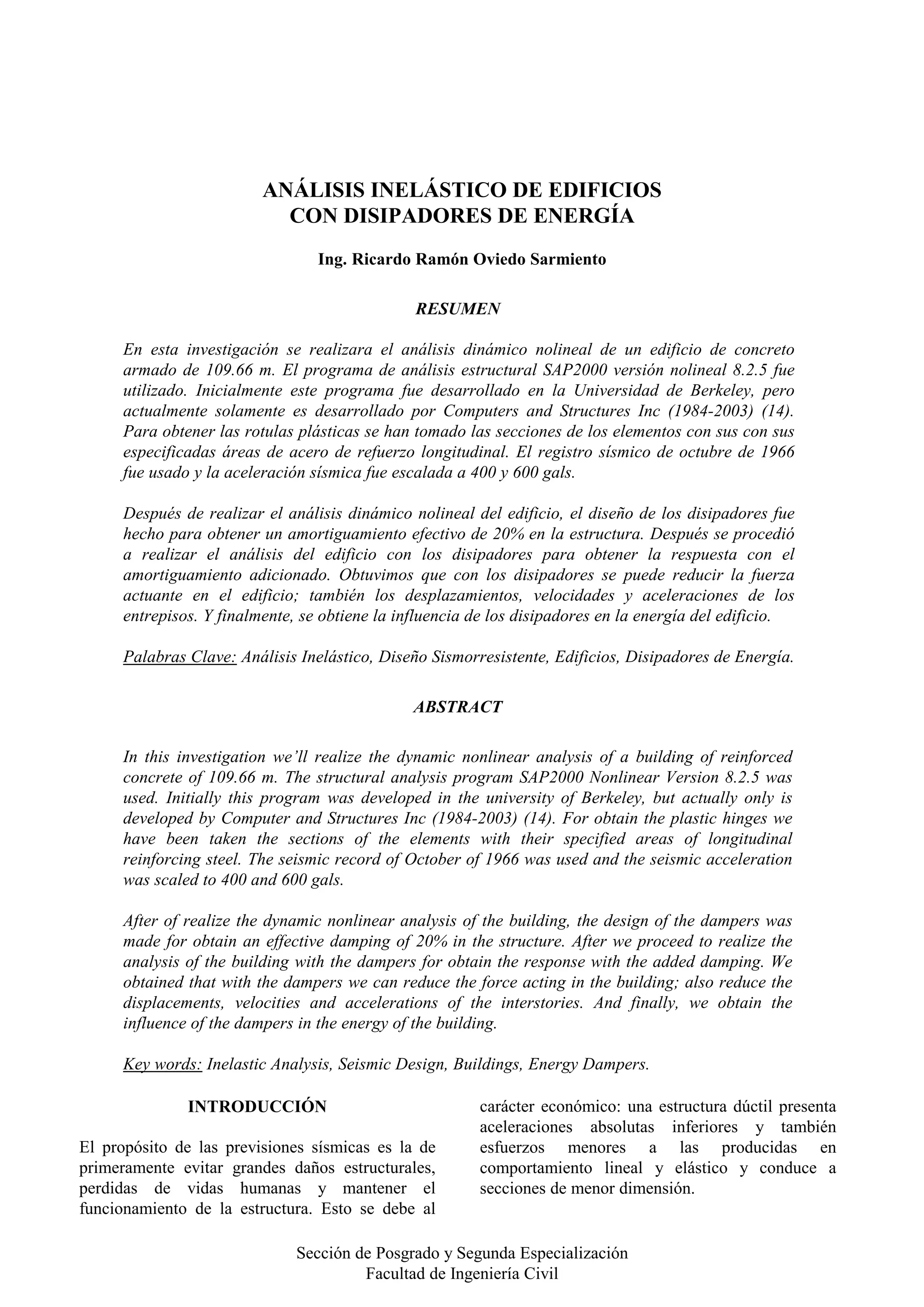 Este documento describe un análisis dinámico no lineal de un edificio de concreto armado de 109.66 metros utilizando el programa SAP2000. Se realizó un análisis del edificio con y sin disipadores de energía diseñados para proporcionar un 20% de amortiguamiento efectivo. Los resultados mostraron que los disipadores pueden reducir las fuerzas, desplazamientos, velocidades y aceleraciones en el edificio durante un terremoto.