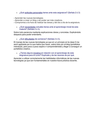 Este resumen describe las reflexiones de una estudiante sobre la asignatura de Educación y Sociedad. La estudiante encuentra interesante aprender sobre las nuevas tecnologías y ampliar sus conocimientos en un tema actual. También le parece útil el módulo sobre pedagogía y TIC. Sin embargo, cree que la carga de trabajo es excesiva. Sus actitudes incluyen aprender sobre nuevas tecnologías y crear un blog. Sus necesidades son paciencia y explicaciones claras, y sus dificultades iniciales incluyen el manejo de las