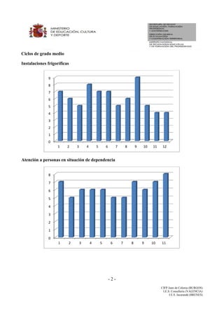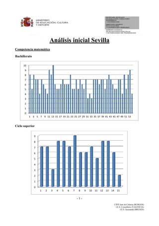 Este documento presenta los resultados de un análisis inicial de las competencias matemáticas y lingüísticas de los estudiantes de tres centros educativos: CIFP Juan de Colonia en Burgos, IES Conselleria en Valencia e IES Jacarandá en Brenes. Contiene gráficos que muestran los porcentajes de estudiantes con competencias por debajo o por encima de cinco en matemáticas, y con niveles B1 o B2 en lenguaje, distribuidos por nivel educativo. La mayoría de los estudiantes tienen compet