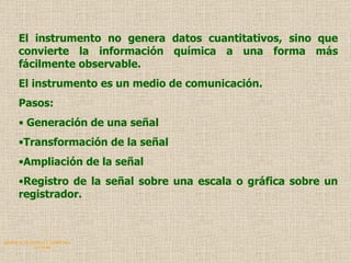 El documento aborda el análisis instrumental en química analítica y agrícola, destacando la espectrofotometría como método clave para medir concentraciones químicas mediante la absorción y emisión de radiación. También se discuten técnicas como la absorción atómica, fluorescencia de rayos X y cromatografía, explicando su funcionamiento y aplicaciones en la separación y análisis de sustancias. Se subrayan las leyes de absorción de Lambert y Beer, así como la importancia de la elección de métodos y condiciones adecuadas para obtener resultados precisos.