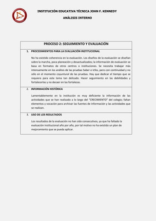 La Institución Educativa Técnica John F. Kennedy carece de una planificación y direccionamiento estratégico claro, una evaluación institucional efectiva y mecanismos de comunicación funcionales. No ha establecido alianzas con el sector productivo ni mantiene relaciones interinstitucionales consistentes. Su gobierno escolar existe pero no cumple con sus funciones de manera sistemática.