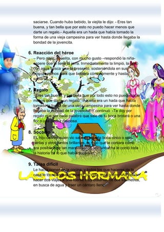 Una joven huye de su madre y hermana al bosque debido al maltrato. Mientras recoge agua, una anciana le pide de beber, a lo que la joven accede amablemente. La anciana resulta ser un hada que le otorga el don de que al hablar salgan flores o piedras preciosas de su boca. El príncipe se enamora de ella y se casan.