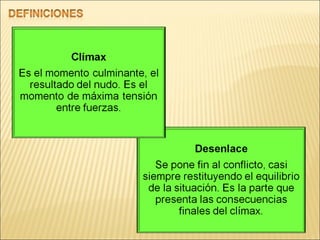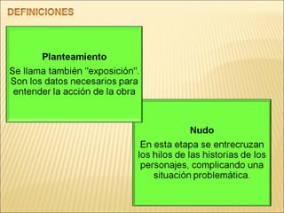 El documento resume los elementos clave para analizar una obra literaria, incluyendo el argumento, tema, personajes, estructura, universo interno, forma y estilo. También distingue entre diferentes tipos de narradores como el omnisciente y en primera persona, y entre personajes principales, secundarios y de ausencia.
