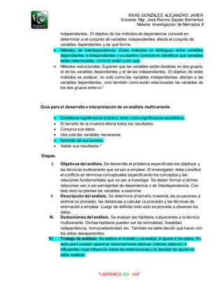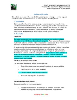 El documento aborda el análisis multivariado, explicando su importancia para entender relaciones complejas entre varias variables simultáneamente. Se detallan los objetivos, tipos y etapas del análisis, así como la guía para su interpretación y validación. Se concluye que este tipo de análisis proporciona información valiosa que los métodos univariantes y bivariantes no pueden ofrecer.