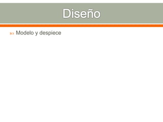 Este documento presenta cuatro categorías para analizar un proyecto: morfológico, técnico, socioeconómico y funcional. También describe las etapas de modelado, despiece, integrantes, tareas y montaje para el proyecto, usando materiales reciclados.