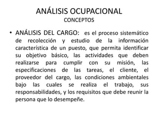 El documento describe los conceptos clave del análisis ocupacional. Explica que el análisis de cargo es el proceso de recopilar información sobre un puesto para identificar su objetivo, actividades, tareas, requisitos y responsabilidades. La descripción de cargo es la documentación ordenada de las características de un puesto identificadas en el análisis. El documento también cubre conceptos como cargo, función, manual de cargos y el proceso de análisis ocupacional.