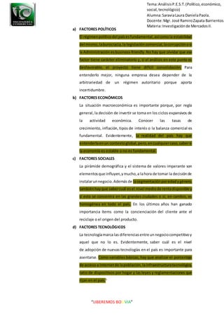 El documento discute el análisis PEST (Político, Económico, Social y Tecnológico), que es una herramienta clave para entender el macroentorno que afecta a las empresas y facilita la toma de decisiones estratégicas. Se presenta la definición, desarrollo y características del análisis PEST, así como los pasos para su implementación y su relación con el análisis DOFA. En conclusión, este análisis es fundamental para evaluar oportunidades y amenazas antes de establecer una empresa en un nuevo mercado.