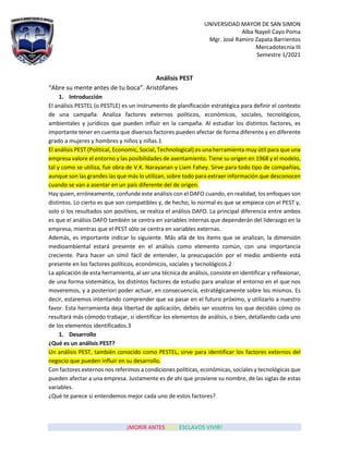 El documento presenta una introducción al análisis PEST (factores políticos, económicos, sociales y tecnológicos) como una herramienta de planificación estratégica para identificar factores externos que pueden influir en una campaña o empresa. Explica cada uno de los factores del análisis PEST y cómo realizarlo, incluyendo la recopilación de variables relevantes, identificación de oportunidades y amenazas, y creación de un plan de acción. Concluye que el análisis PEST puede ayudar a