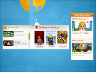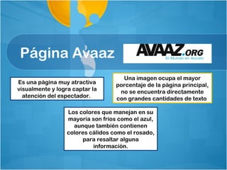 El documento analiza las características de diseño de varias páginas web populares como Avaaz, National Geographic Channel, CNN, Sony, Mercedes-Benz, Vespa, LendingClub, Lego y Yale-New Haven Hospital. Describe cómo distribuyen y organizan la información, los colores y contenidos utilizados, así como aciertos y desaciertos en su diseño interactivo y facilidad de uso.