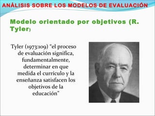 Este documento analiza diferentes modelos de evaluación educativa, incluyendo el modelo orientado por objetivos de Tyler, el modelo orientado por la toma de decisiones de Stufflebeam, el modelo centrado en el cliente de Stake, el modelo orientado al consumidor de Scriven, el modelo de evaluación como crítica artística de Eisner, el modelo de gerencia estratégica de Fred, el modelo de evaluación de la calidad del CINDA y el modelo de evaluación institucional de la Orden Oz.