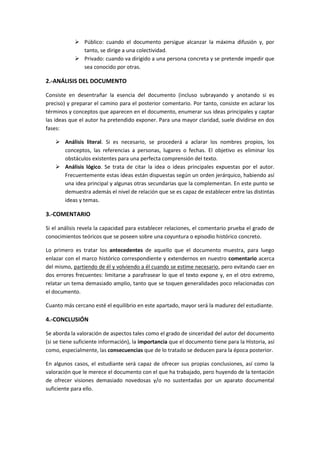 Este documento proporciona instrucciones para analizar y comentar documentos históricos. Explica cómo clasificar el documento, analizar su contexto espacio-temporal y autor, identificar las ideas principales a través de un análisis literal y lógico, comentar los antecedentes e implicaciones históricas, y llegar a una conclusión que valore la importancia y consecuencias del documento.