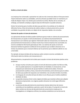 El documento habla sobre el análisis y minería de datos. Explica que las empresas usan cada vez más datos en línea para tomar mejores decisiones comerciales. También describe herramientas para el análisis de datos que permiten ver los datos de diferentes formas y realizar cálculos previos para responder rápidamente a consultas. Además, explica sistemas de ayuda a la toma de decisiones y los retos de almacenar y recuperar grandes cantidades de datos de múltiples orígenes para adoptar decisiones empresariales.