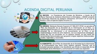 El documento compara las agendas digitales de Perú, Chile y Argentina. Resume que la Agenda Digital Peruana busca permitir que la sociedad peruana acceda a los beneficios de las TIC. La Agenda Digital Chilena tiene como misión transformar la economía chilena en una economía del conocimiento a través del uso de las TIC. Y la Agenda Digital Argentina fue creada para impulsar la conformación de un gabinete multisectorial orientado al aprovechamiento de las posibilidades de la sociedad de la información.