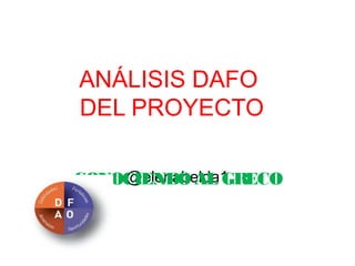 El documento presenta un análisis DAFO de un proyecto educativo. Entre las fortalezas se encuentra que los alumnos participan activamente y el proyecto es innovador. Las debilidades incluyen problemas de conexión a internet y falta de recursos tecnológicos. Las oportunidades son colaborar con otros centros y mejorar las competencias digitales. Las amenazas son falta de equipos y espacio. Las líneas de acción son animar a otros profesores, solicitar más recursos tecnológicos y formación continua.