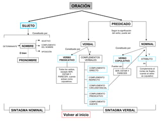 Este documento proporciona una explicación detallada de los diferentes elementos que componen una oración, incluyendo el sujeto, predicado, atributo, complementos directos e indirectos, y complementos circunstanciales. Explica las formas en que cada uno de estos elementos puede aparecer en una oración y cómo se pueden identificar. También describe los diferentes tipos de verbos como copulativos, transitivos e intransitivos, y el proceso de transformar una oración activa a pasiva.
