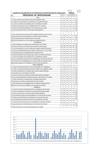 Este documento presenta una tabla de valoración de 10 preguntas de investigación en cada una de las categorías de Tecnología, Medio Ambiente y Marinilla. Cada pregunta se evalúa en términos de factibilidad, puntaje tecnológico, tiempo de solución, innovación, costo y puntaje total. La tabla proporciona una forma cuantitativa de comparar y seleccionar preguntas de investigación en diferentes áreas temáticas.