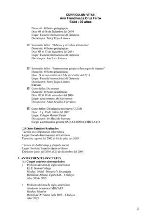 Ann Franchesca Cruz Farro es una técnica en el idioma inglés americano con 8 años de experiencia y estudios superiores en computación e informática. Actualmente estudia bachillerato y licenciatura en idiomas extranjeros en la Universidad Nacional Pedro Ruiz Gallo. Su currículum incluye varios seminarios y cursos en inglés y tecnología, así como experiencia docente en varias escuelas primarias y secundarias en la enseñanza de inglés y computación.