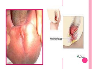 El ano imperforado es una malformación congénita en la que el ano está ausente o bloqueado. Puede presentarse de varias formas como un recto que termina en una bolsa ciega, aberturas anormales entre el recto y los órganos reproductivos o urinarios, o ausencia completa del ano. Los síntomas incluyen dificultad para eliminar las heces. El diagnóstico se realiza al nacer y generalmente requiere cirugía para corregir la malformación.