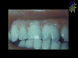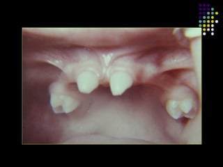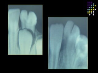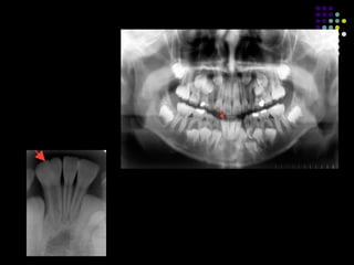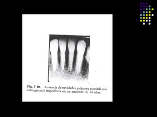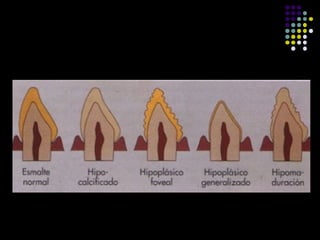 El documento resume diferentes anomalías dentales, incluyendo cambios en el número, forma y estructura interna de los dientes. Se describen condiciones como microdoncia, macrodoncia, geminación, fusión, dens in dente, taurodontismo, perlas de esmalte, hipoplasia del esmalte, fluorosis, amelogenesis imperfecta y dentinogénesis imperfecta. El documento provee detalles clínicos y radiográficos característicos de cada anomalía.
