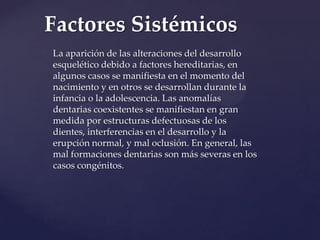 Las anomalías dentarias se originan por perturbaciones sistémicas en la infancia y pueden incluir defectos en el número, estructura y tamaño de los dientes. Estas anomalías pueden ser congénitas o hereditarias y se asocian con condiciones como el síndrome de Klinefelter y el síndrome de Down. La clasificación actual de anomalías dentarias se basa en el desarrollo y abarca varias categorías, incluyendo número, tamaño, forma, estructura y color.