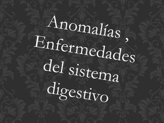 El documento describe varias enfermedades del sistema digestivo, incluyendo la apendicitis, que causa dolor abdominal y vómitos; la peritonitis, que es la inflamación del peritoneo causada por bacterias de una apendicitis no tratada; y la diarrea, que es la defecación frecuente de materia líquida. También describe enfermedades de la boca, encías, esófago, estómago, intestinos delgado y grueso, recto, ano y páncreas.