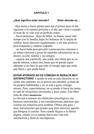 Este documento presenta un resumen de los primeros capítulos de un libro sobre el cambio positivo. Describe lo que significa estar atorado y las barreras que impiden el cambio como baja autoestima, miedo al fracaso y falta de voluntad. Explica que todos se quedan atorados en algún momento y ofrece herramientas para superar los obstáculos y volver al camino hacia metas más satisfactorias.