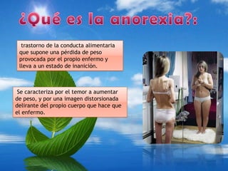 La anorexia es un trastorno alimentario que causa pérdida de peso debido al temor a engordar y una imagen distorsionada del propio cuerpo. Los síntomas incluyen miedo al aumento de peso, percepción distorsionada del cuerpo, y rechazo a mantener un peso saludable. Las causas pueden ser obesidad previa, eventos estresantes o fracasos. Los daños van desde la pérdida de cabello y problemas dentales hasta complicaciones más serias en los huesos, corazón y cerebro.