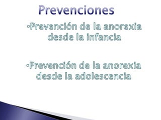 La anorexia es un trastorno alimentario caracterizado por un temor excesivo a aumentar de peso que lleva al paciente a restringir drásticamente la ingesta de alimentos y ejercitarse en exceso para perder peso de forma peligrosa, a pesar de estar por debajo de lo saludable. Se trata mediante modificación de hábitos alimenticios, control de peso y terapias psicológicas.