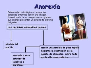 La anorexia es un trastorno psicológico en el que las personas se ven gordas a pesar de estar extremadamente delgadas y restringen su ingesta de alimentos para perder peso rápidamente. Los tratamientos intentan corregir la malnutrición y las disfunciones psíquicas a través de terapias familiares, conductuales, medicamentos y psicoterapia.