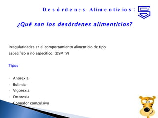 El documento proporciona información sobre diferentes trastornos alimenticios como la anorexia, bulimia, vigorexia y ortorexia. Describe los síntomas, causas y complicaciones de cada uno, así como formas de detección y tratamiento. También ofrece consejos sobre cómo ayudar a alguien que los padece y qué evitar hacer.