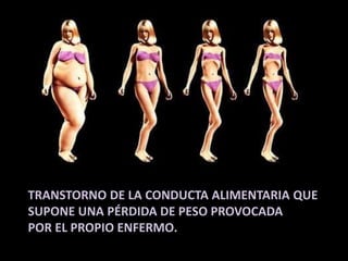 El documento describe la anorexia como un trastorno alimentario que implica la pérdida de peso intencional por parte del paciente. Explica que existen diferentes tipos de anorexia como la nerviosa primaria o secundaria, y describe algunas de sus causas como la obsesión por la belleza o la depresión. Finalmente, señala algunos de los síntomas como la distorsión de la imagen corporal y el miedo a ganar peso, y los tratamientos recomendados como la terapia familiar y la medicamentosa.