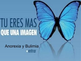 Este documento describe la anorexia y la bulimia, trastornos alimenticios que se caracterizan por una preocupación excesiva por el peso y la apariencia física. La anorexia implica mantener un peso corporal muy bajo, mientras que la bulimia involucra episodios recurrentes de comer en exceso seguidos de purgas. Ambos trastornos pueden causar graves consecuencias para la salud si no se tratan, y su tratamiento implica tanto la recuperación de hábitos alimenticios saludables como el tratamiento psicoló