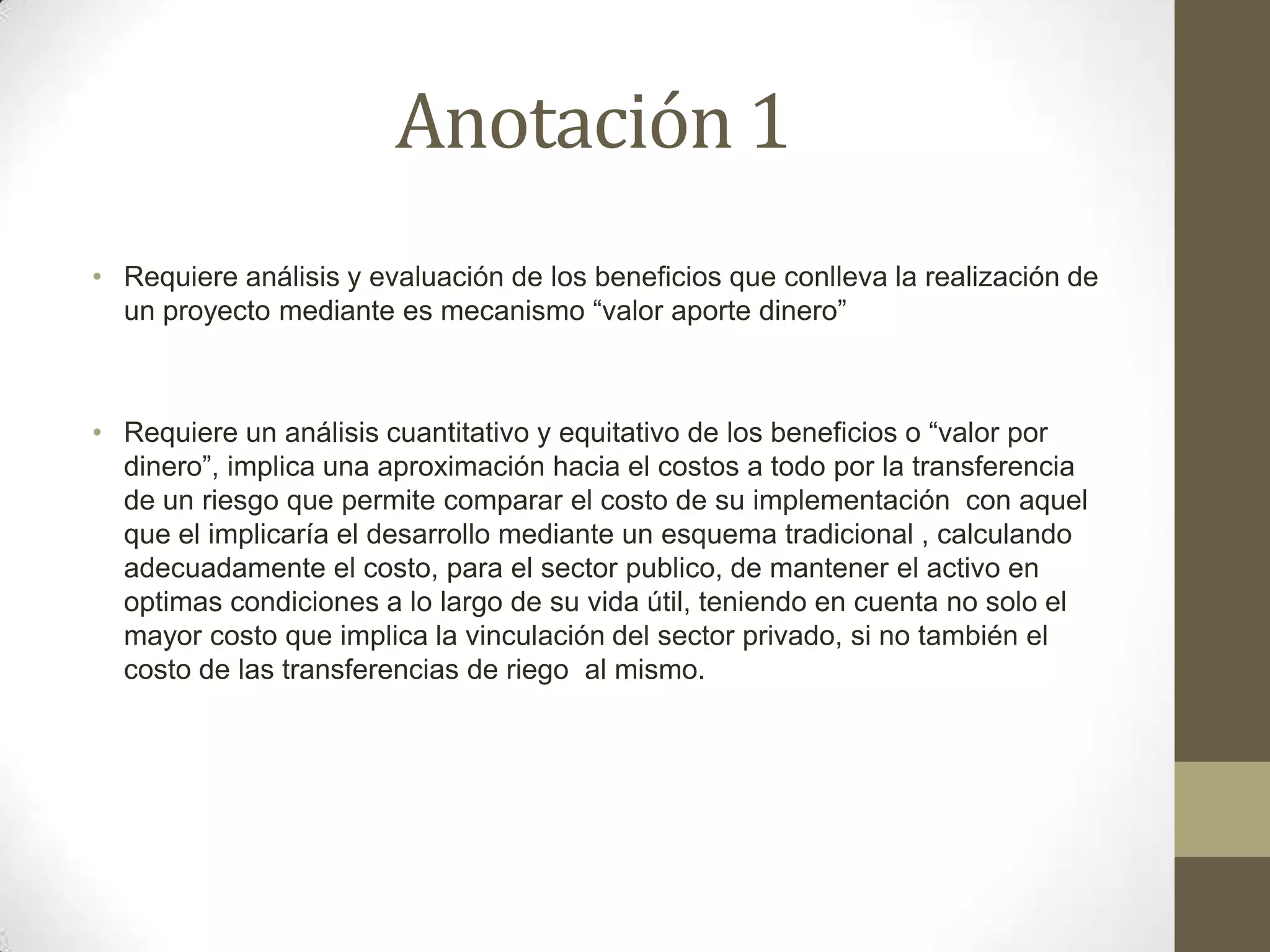 El documento requiere un análisis cuantitativo y equitativo de los beneficios de realizar proyectos mediante asociaciones público-privadas (APP) comparando los costos de implementación con esquemas tradicionales. También recomienda diseñar metodologías e institucionalizar procedimientos para la preparación, evaluación y estructuración de proyectos de APP que permitan la modernización de infraestructura pública de manera eficiente.